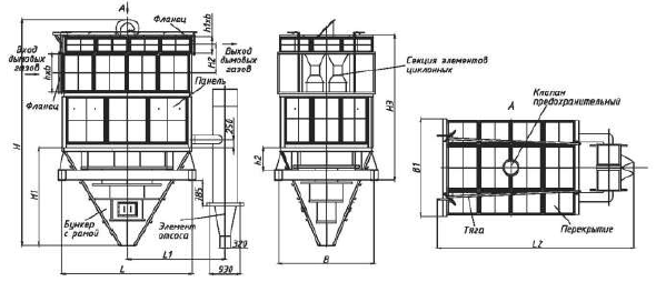 Батарейные циклоны БЦ-245-1-(5x5) — это ряд полых цилиндрических корпусов с конусообразной нижней частью, входными патрубками и аппаратами закручивания (полуулитками). Внутри общего корпуса батарейного циклона расположен ряд циклонных элементов, где каждый последующий устанавливается ниже предыдущего.
