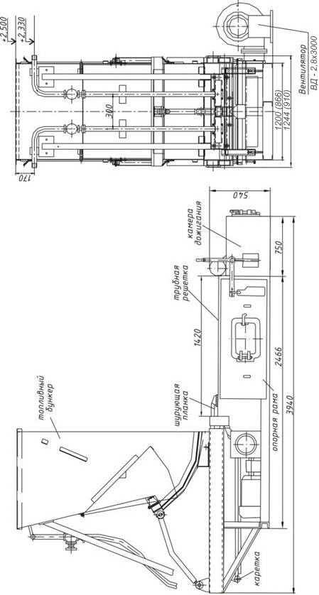 Топка ТШПМ-2.5 состоит из бункера для хранения топлива с шурующей планкой, неподвижной колосниковой решетки, установленной на раме и, собственно, корпуса топки из жаропрочной стали. При помощи шурующей планки топливо из бункера поступает на колосниковую решетку. Планка распределяет куски топлива по поверхности решетки и начинается процесс горения. Для более интенсивного горения и полноценного расхода топлива в системе предусмотрены вентиляторы, которые обеспечивают дополнительный приток воздуха в топку, снизу, через отверстия решетки. В рабочем состоянии топка поддерживает температуру решетки и шурующей планки, охлаждая их при помощи системы трубопровода.